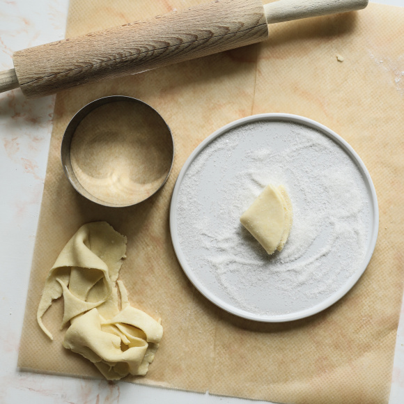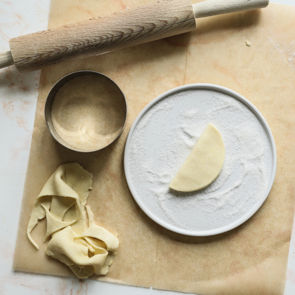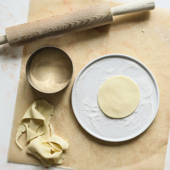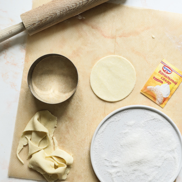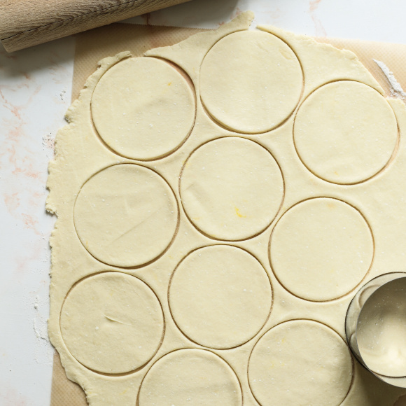 Круглой кондитерской вырубкой либо стаканом подходящего диаметра вырезаем из теста круги. Их должно получиться около 16 штук.