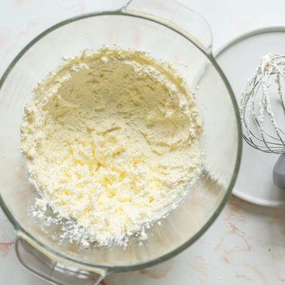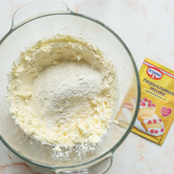 Тщательно просеиваем пшеничную муку, смешиваем её с разрыхлителем, затем аккуратно вводим мучную смесь во взбитую массу и приступаем к замесу теста. Для получения качественного замеса рекомендуется воспользоваться миксером со специальной К-образной насадкой.