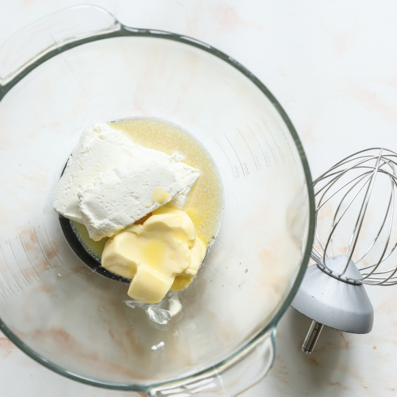 В глубокой ёмкости смешиваем творог со сливочным маслом и при помощи миксера либо вручную взбиваем до получения однородной массы.