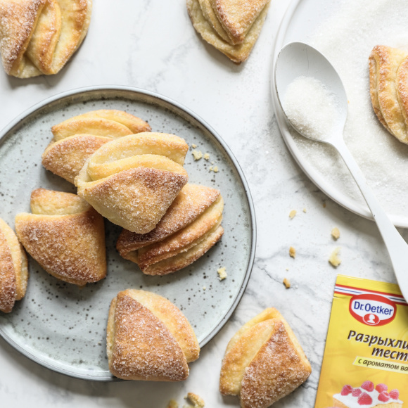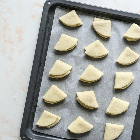 Снова складываем заготовки печенья пополам, сахарной стороной внутрь. В результате у вас должны получиться небольшие треугольники из теста.