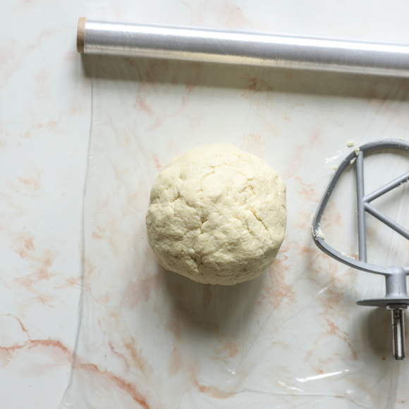 Готовое тесто необходимо скатать в шар, обернуть пищевой плёнкой и отправить в холодильник на 30-40 минут.