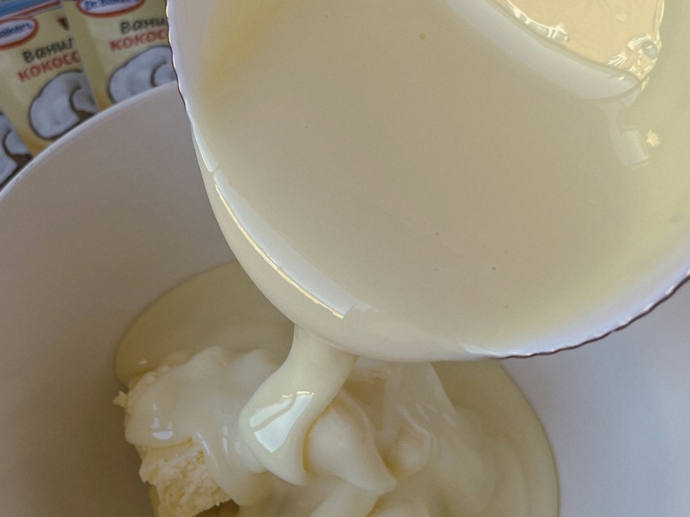 Если все продукты подготовить заранее и положить рядышком, замесить тесто можно за 5 минут, если не меньше. Достаточно все 3 ингредиента сложить в миску и замесить тесто. Но мы разобьем это на два этапа: сначала разотрем венчиком сгущенку с маслом.