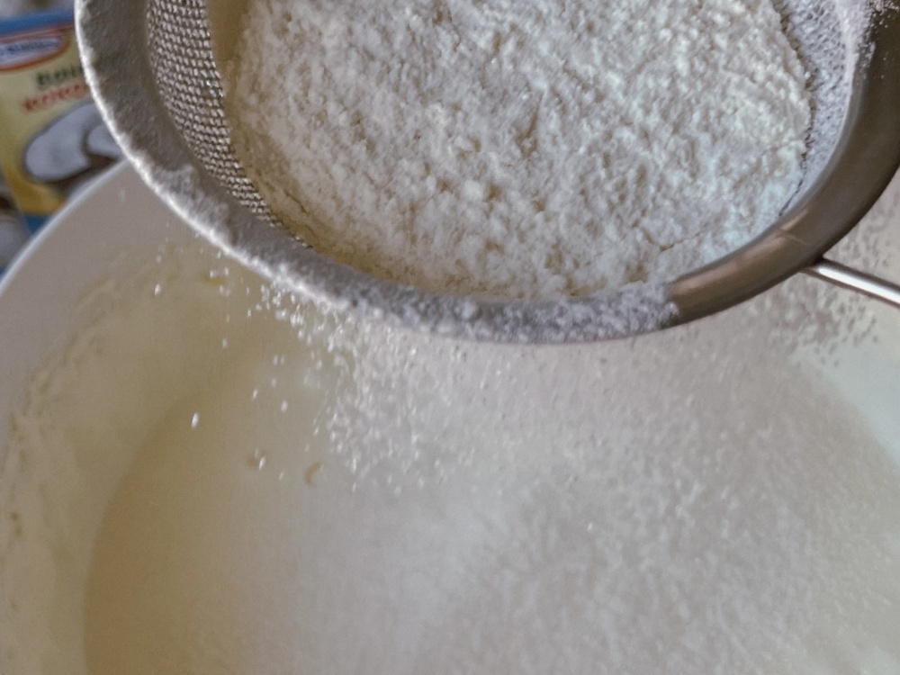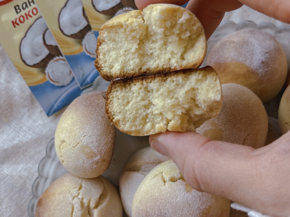 Затем добавим муку, кокосовый ванилин и замесим тесто. Тесто получается очень мягким, однородным, не липким. Но оно рассыпчатое и его скалкой раскатать не получится — будет крошиться!