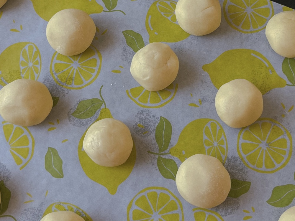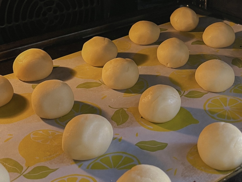 От общего полученного куска теста, прямо руками, начинаем отрывать небольшие кусочки (грамм 30-40), скатываем их на ладони шариками и выкладываем на противень, смазанный маслом или застеленный пергаментной бумагой.