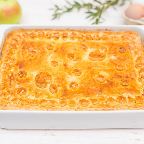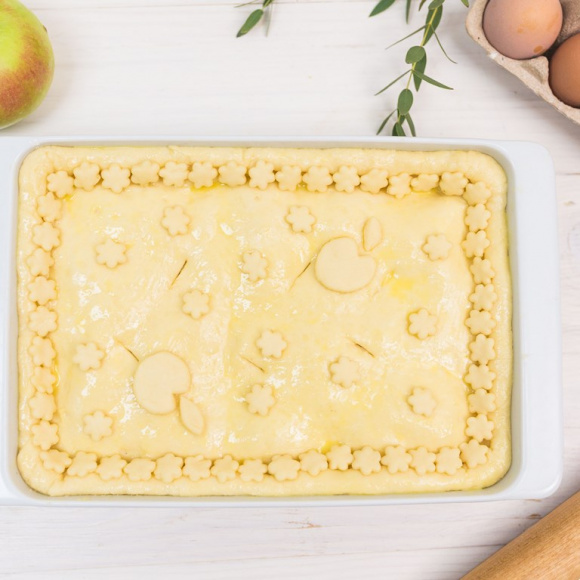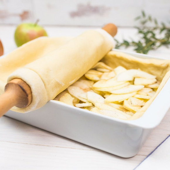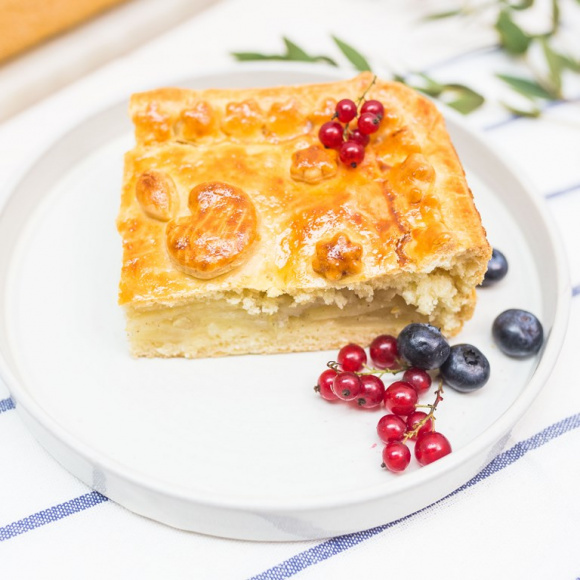 Выкладываем на тесто яблочную начинку, стараясь распределять её равномерным слоем. Накрываем начинку вторым пластом теста и защипываем края.