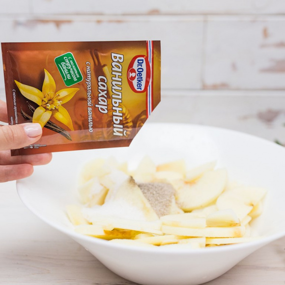 Пока тесто поднимается, займёмся приготовлением начинки для пирога. Крупные яблоки (предпочтительно кислых сортов) очищаем от кожуры и нарезаем тонкими ломтиками. Перекладываем яблоки в миску, добавляем сахарный песок, ванильный сахар и хорошо всё перемешиваем.