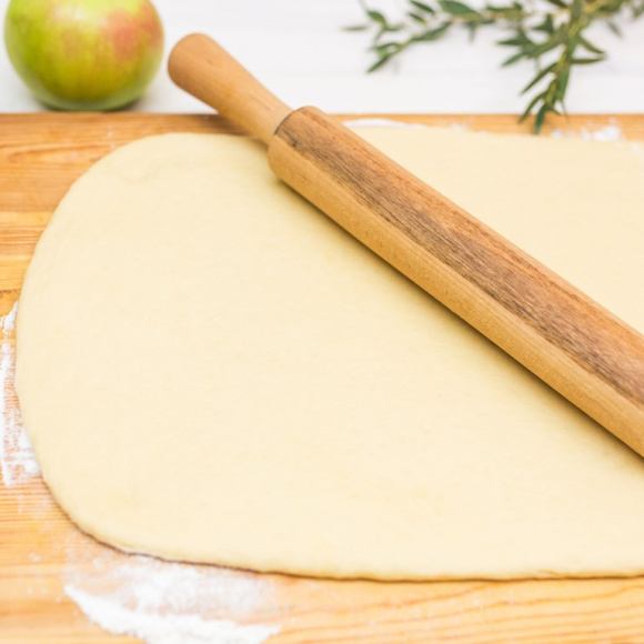 Используя скалку, раскатываем тесто в пласт толщиной 5 мм. При этом размеры пласта должны соответствовать размерам формы для выпечки.