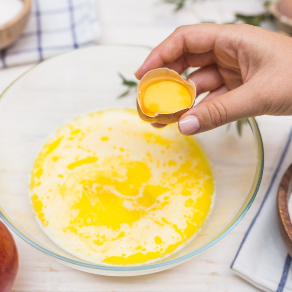 В остывшую до комнатной температуры смесь молока и масла разбиваем 2 яйца, добавляем мелкую соль, после чего хорошо перемешиваем ингредиенты венчиком.