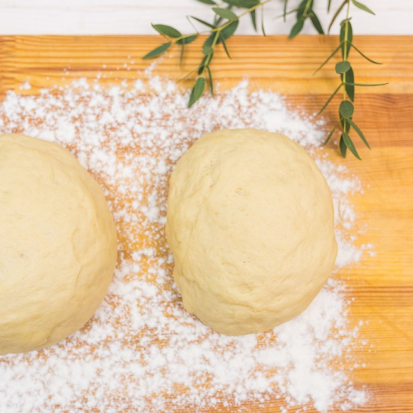 Готовое тесто делим на 2 равные части. Рабочую поверхность присыпаем мукой.