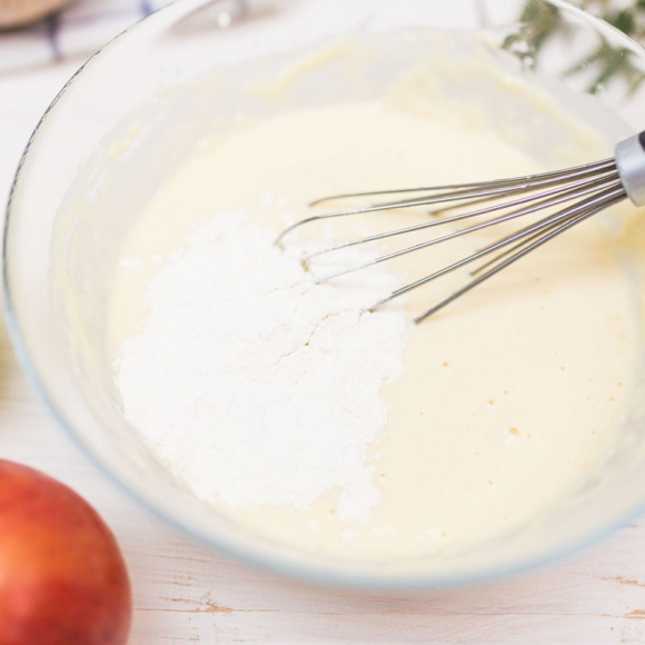 Небольшими порциями вводим мучную смесь, каждый раз хорошо всё перемешивая, чтобы избежать возникновения комочков.