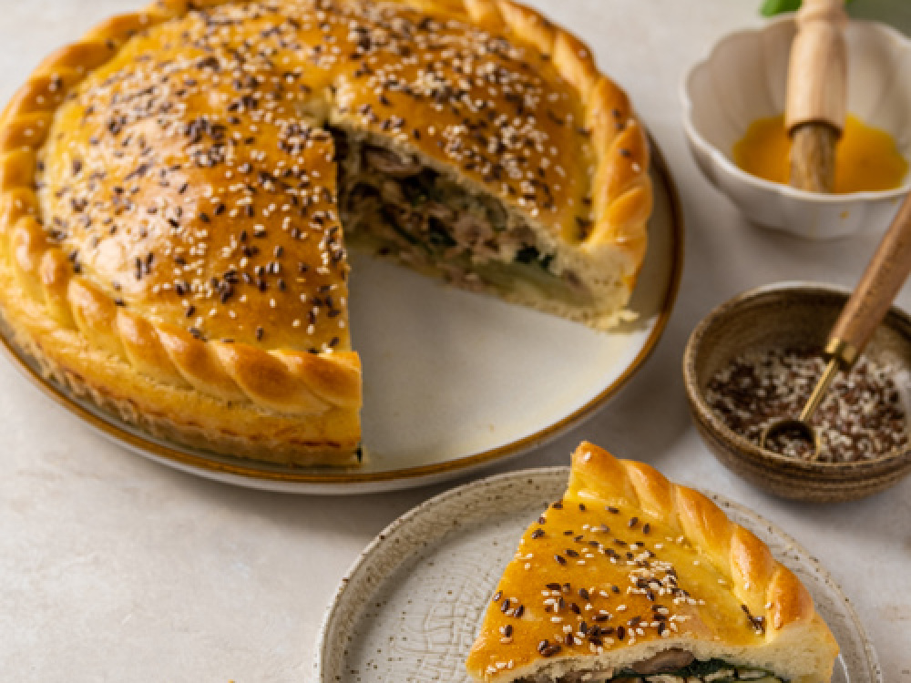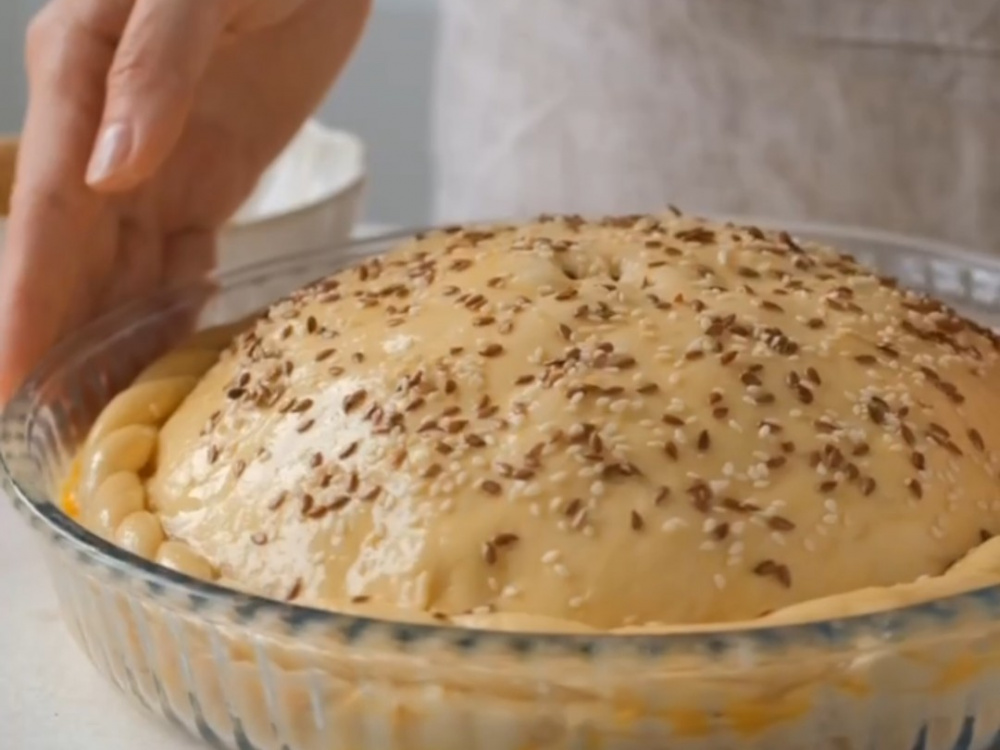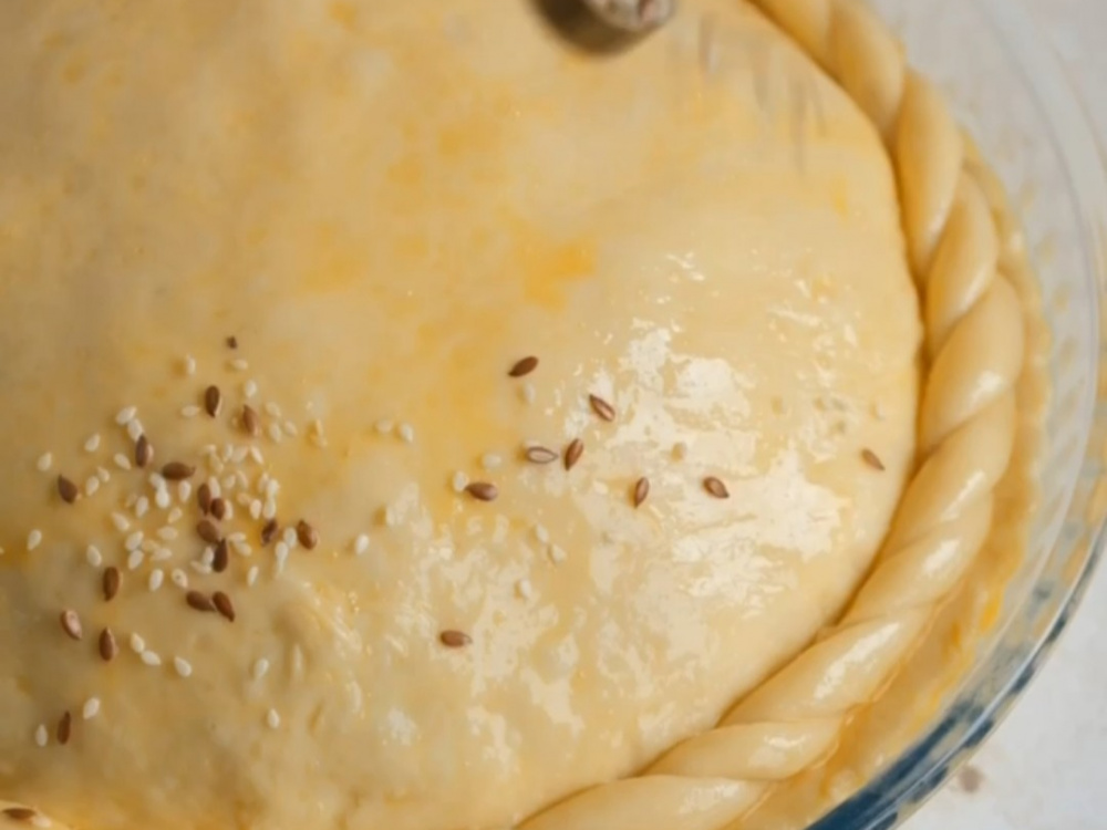 Смазываем пирог смесью желтка (1 шт) и молока (1 ст л). Выкладываем по краю косичку из теста. Посыпаем кунжутом.