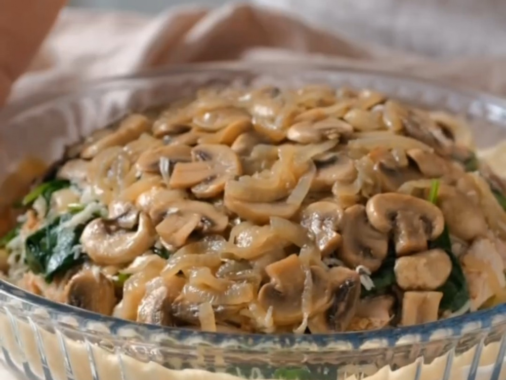 Выкладываем слоями начинку: картофель, шпинат, сыр, курица, шпинат, сыр, грибы, формируя купол. Оставляем по краям свободным 1 см теста.