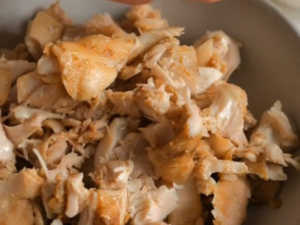 Куриное филе (4 шт) готовим любым способом. Мы запекали в фольге, с солью и специями в духовке при температуре 200°С в течение 45 минут.