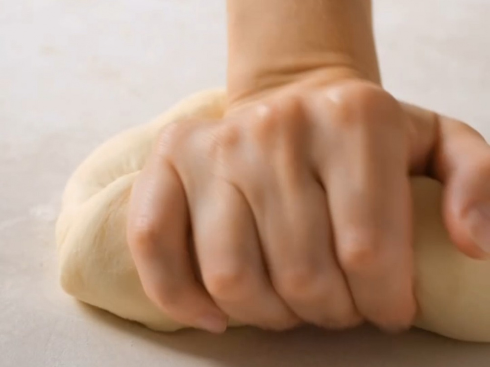 Замешиваем гладкое и пластичное тесто. Чем дольше вы будете вымешивать тесто, тем лучше. Мы вымешивали 10 минут. Формируем из теста шар, перекладываем его в чистую миску, смазанную маслом, накрываем полотенцем и оставляем в тёплом месте расстаиваться 1 час.