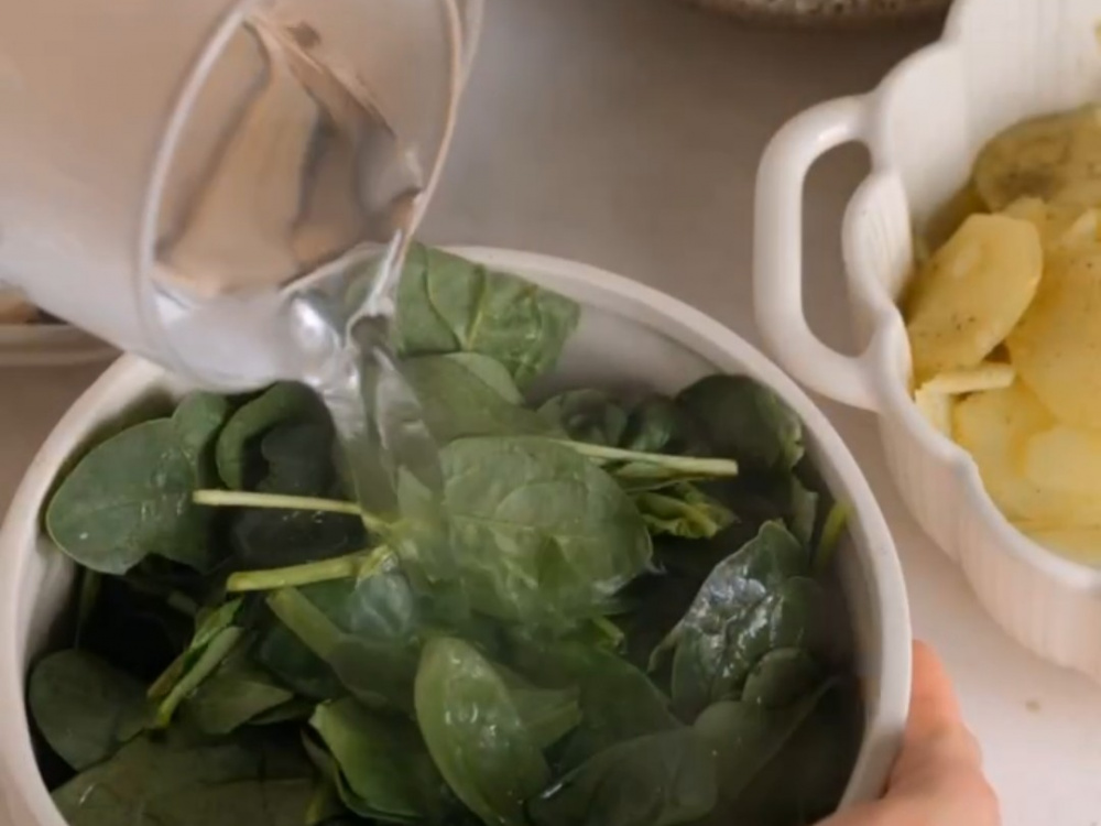 Шпинат (70 г) промываем и заливаем крутым кипятком на 5 минут, сливаем воду. Сыр (50 г) натираем на тёрке.