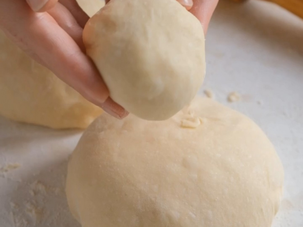 Подошедшее тесто делим на 3 части: большую, среднюю и маленькую и округляем.