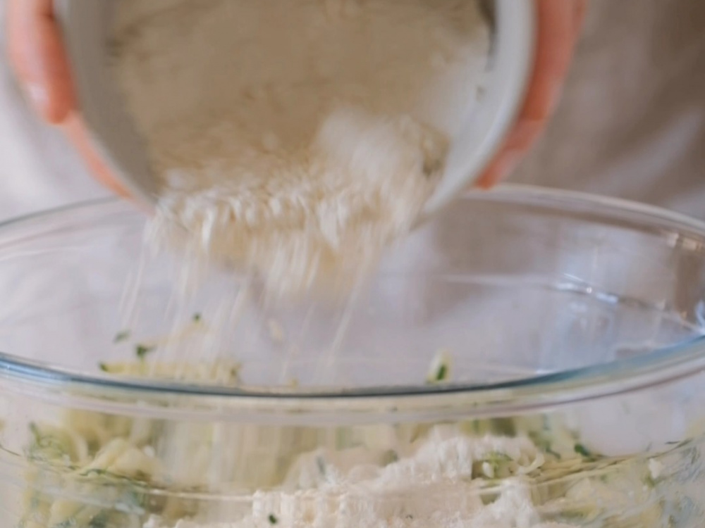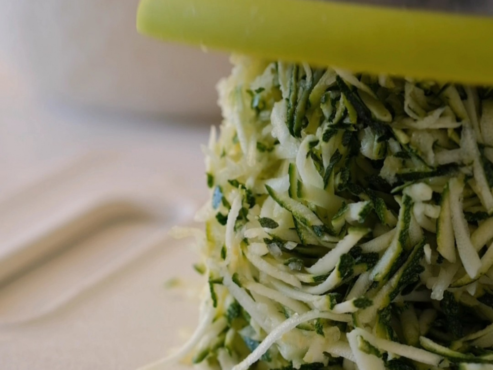 Кабачки (450 г) моем, сушим, срезаем хвостики, при необходимости счищаем кожицу, натираем на тёрке и отжимаем лишнюю жидкость.