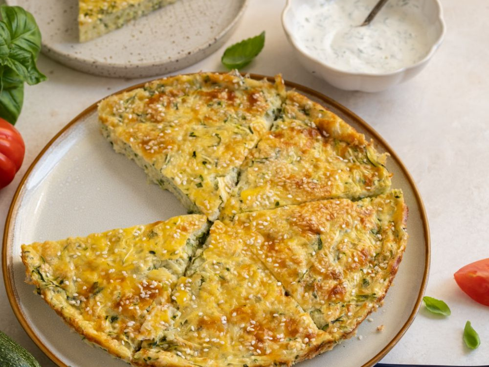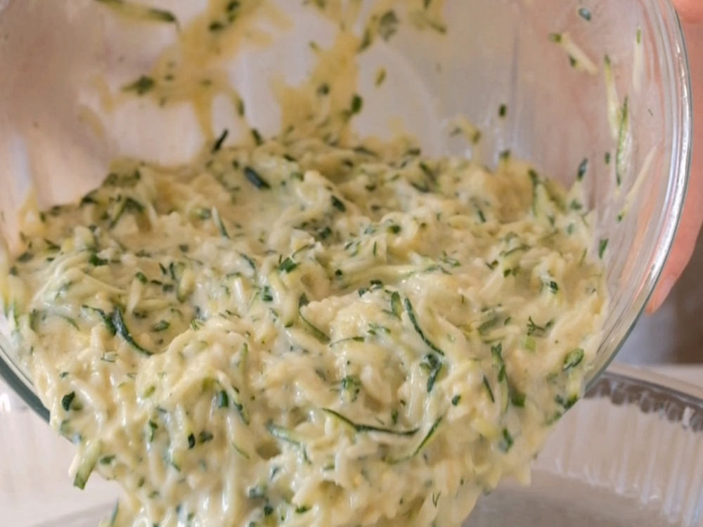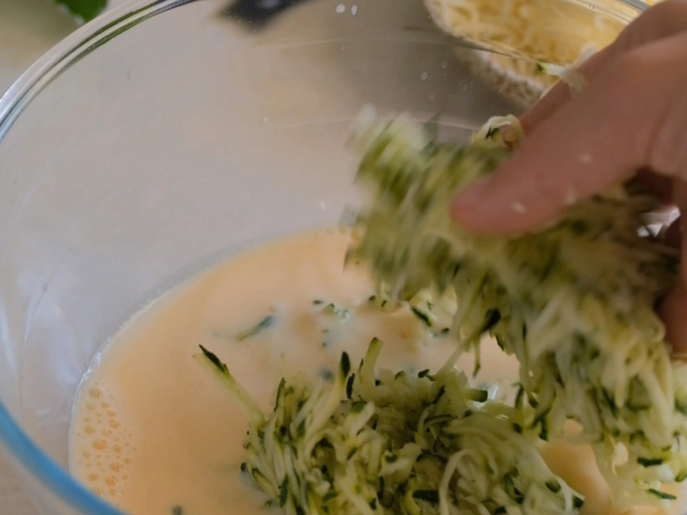 К яичной смеси добавляем кабачки, зелень (20 г) и большую часть натёртого сыра (100 г).