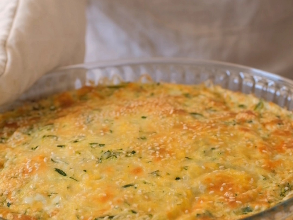 Перекладываем массу в форму, смазанную растительным маслом (20 мл) и посыпаем оставшимся сыром и кунжутом (1 уп.).