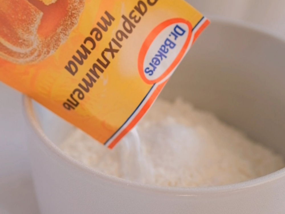 Муку (65 г) смешиваем с разрыхлителем (1 ч. л.) и солью