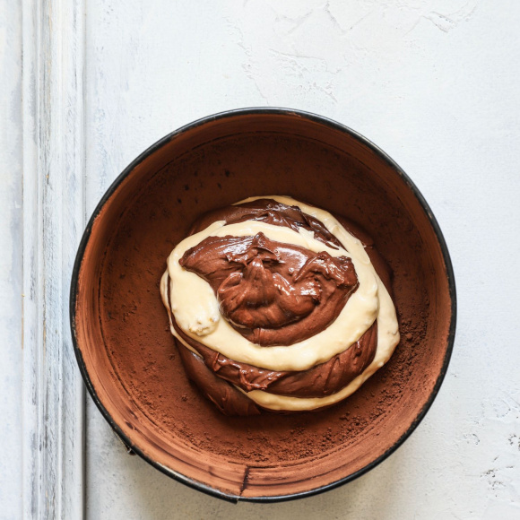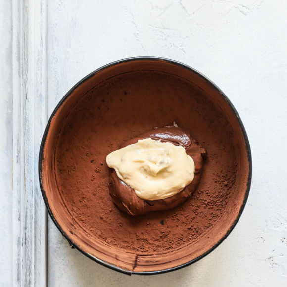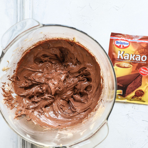 Разделяем массу на две части в пропорции 1 к 3. В меньшую порцию добавляем какао, мешаем до полного его растворения.