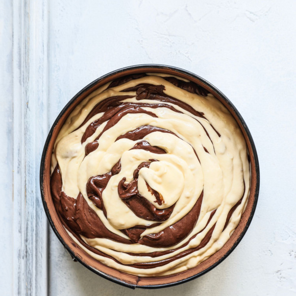 Когда все тесто выложено слоями берем зубочистку и аккуратно перемешиваем, как бы рисуя на бумаге.