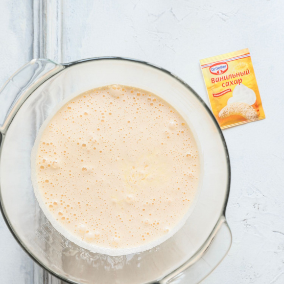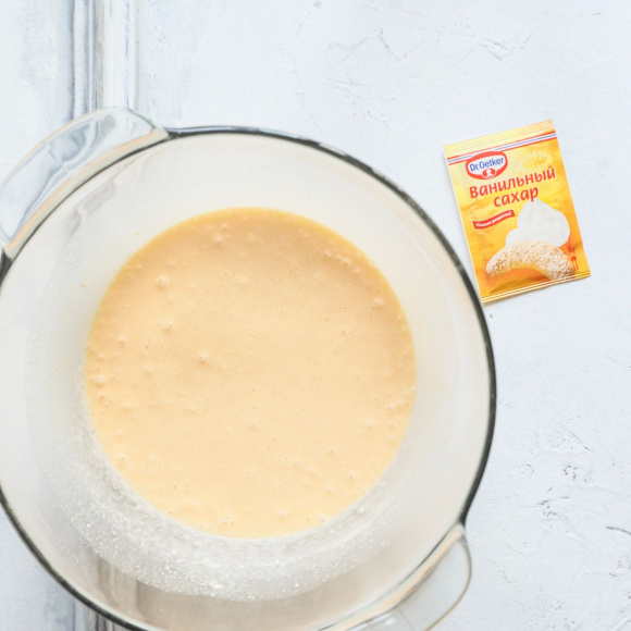 Помоем куриные яйца, разобьем их в емкость, добавим ванильный сахар, взбиваем, используя миксер или блендер.