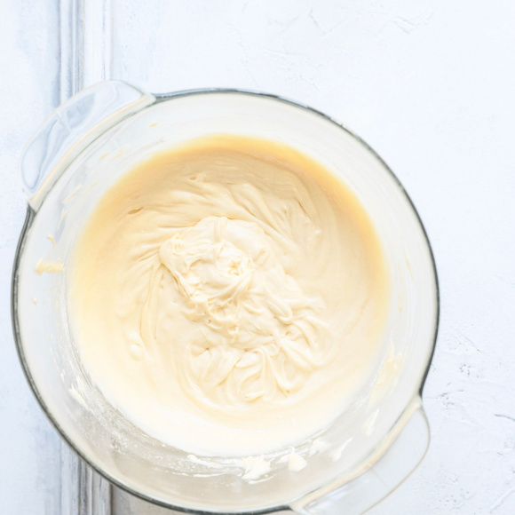 Мягкое сливочное масло нарезаем на кубики, добавляем вместе со сметаной к взбитой массе, еще раз взбиваем