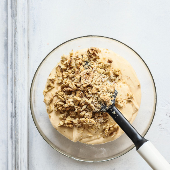 Во вторую - большую порцию массы добавляем измельченные орехи, равномерно распределяем их.
