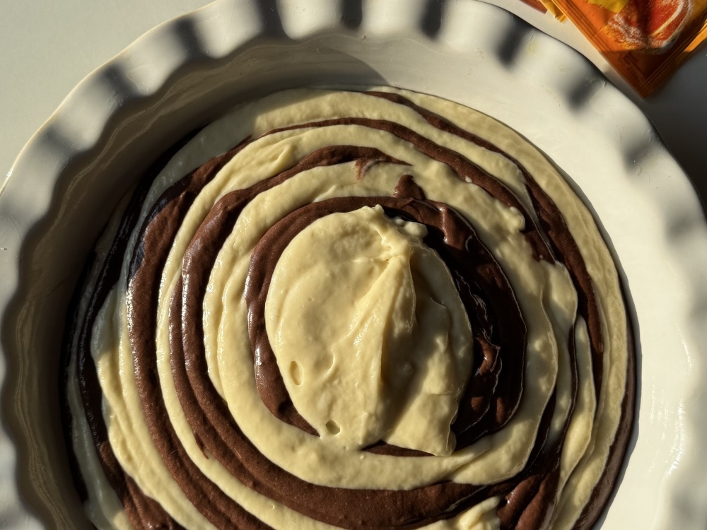 В форму для выпекания начинаем заливать тесто. Аккуратно в равном количество в центр посуды выкладываем сначала белое тесто, потом темное. Когда форма заполнена, ставим выпекаться в духовку на 30 минут на 180 градусов.