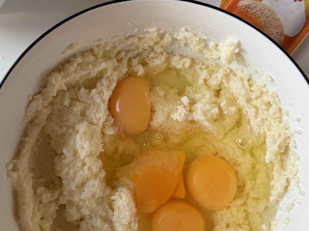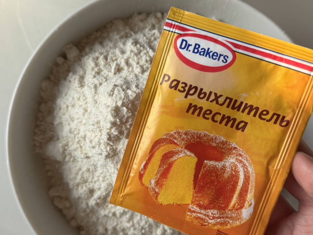 Всыпаем муку с добавлением разрыхлителя. Замешиваем тесто.