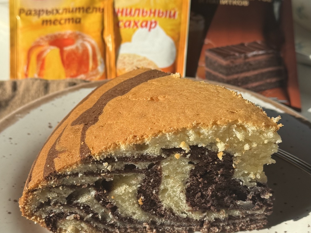 Пирог Зебра — рецепт простой и быстрый. В разогретое до комнатной температуры сливочное масло (масло не должно быть растопленным, это сделает тесто слишком жидким) добавляем два вида сахара. Взбиваем пока все не раствориться (должна получится густая масса). Разбиваем в полученную смесь яйца и после вымешивания добавляем сметану (можно заменить на кефир или сливки).