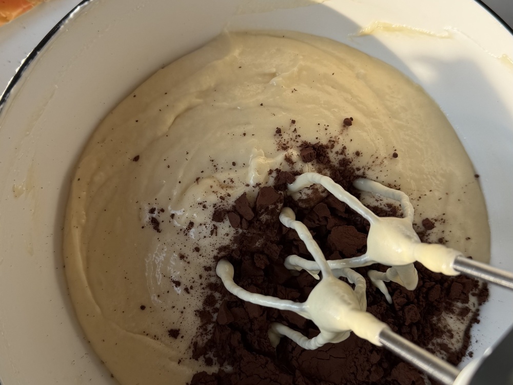 Когда тесто стало однородным, разделяем его на две части: одну оставляем белой, а вторую подкрашиваем какао-порошком.