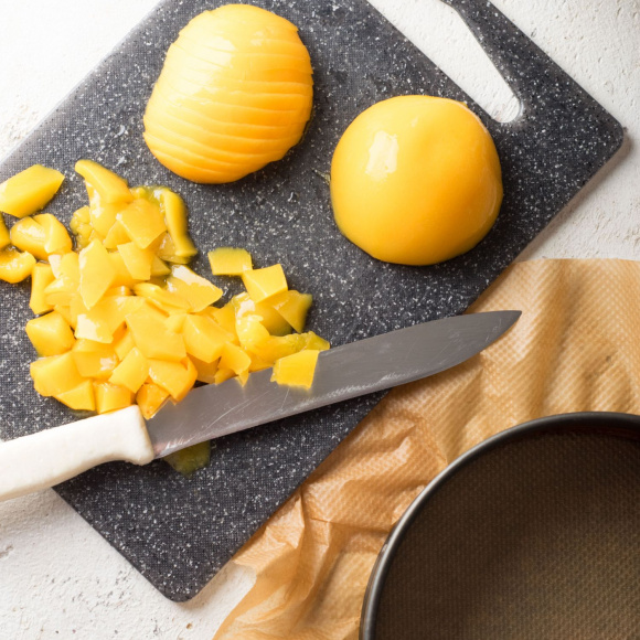 Займемся персиками, помоем их под проточной водой, нарезаем. Все фрукты резать можно произвольно, только один персик режем пополам и нарезаем в виде полосок.