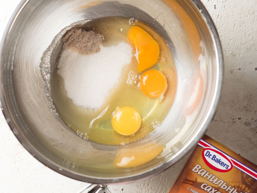 Берем глубокую тарелку, разбиваем туда яйца. Добавляем к ним сахарный песок и ванильный сахар.