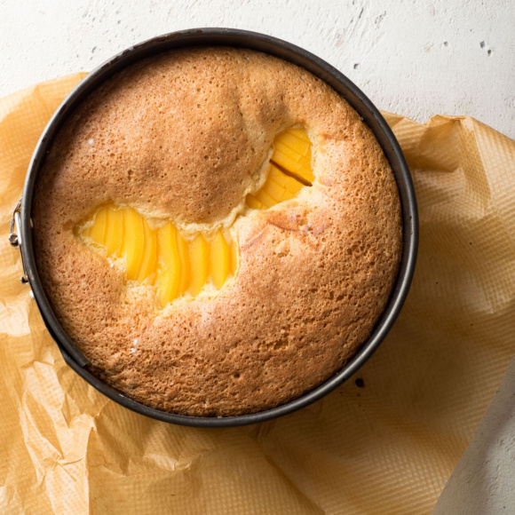 Осталось только запечь нашу шарлотку с персиками, ставим форму в духовой шкаф и выпекаем при температуре 175 градусов. Всего 35 минут и наш пирог с персиками почти готов, осталось его немного остудить и присыпать сахарной пудрой. Приятного чаепития!