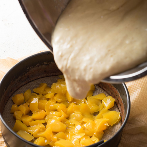 Те персики, которые нарезаны в произвольном виде высыпаем в форму. Сверху заливаем тестом толщиной в 2 см.