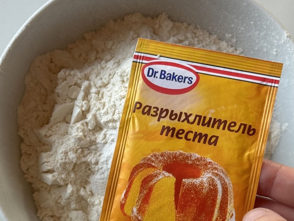 Просеиваем муку и разрыхлитель. Хорошо перемешаем. Тесто должно получиться густым.