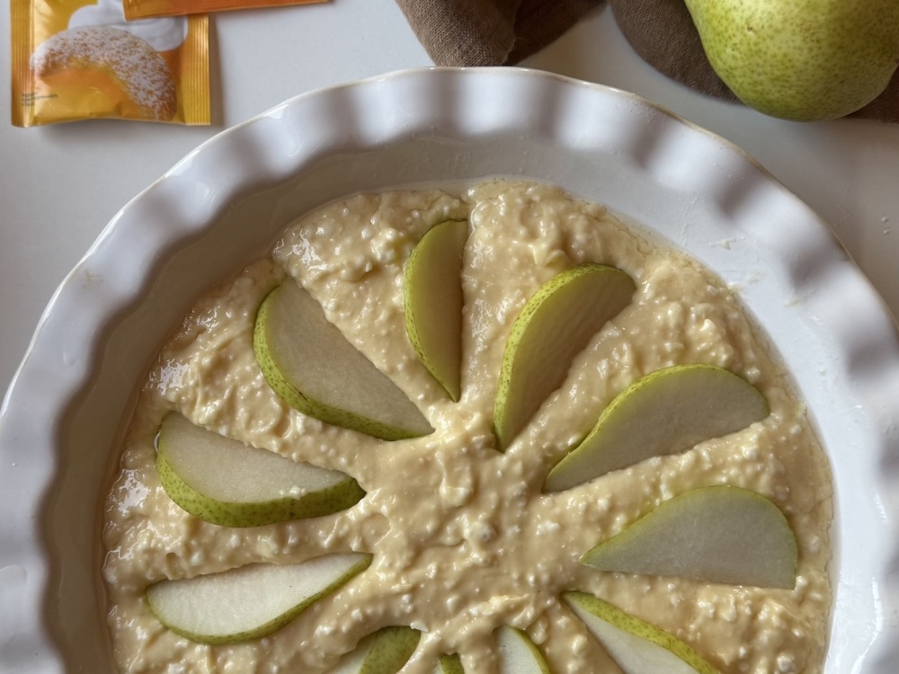 Тесто распределяем по форме и сверху укладываем груши нарезанные дольками. И ставим в разогретую др 180 гр духовку минут на 40-50. Обязательно попробуйте.