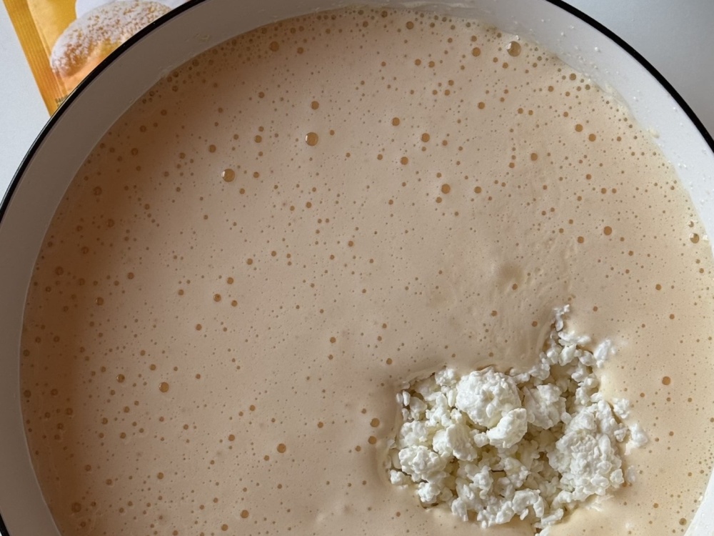 Добавляем растопленное сливочное масло и творог. Перемешиваем.