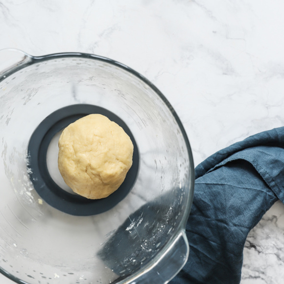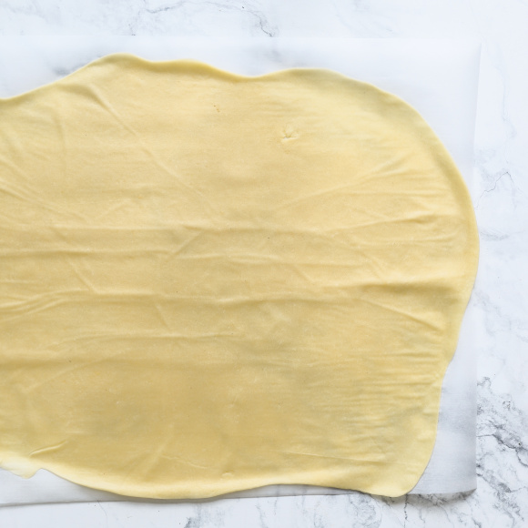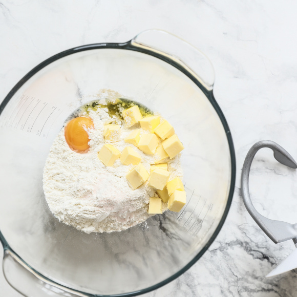 Для приготовления теста просеиваем пшеничную муку в глубокую ёмкость, добавляем яичный желток, мелко нарезанное сливочное масло, соль, сок лимона, оливковое масло и холодную воду. При помощи миксера с насадкой “крюк” замешиваем эластичное тесто (начинаем процесс замешивания с самой низкой скорости).