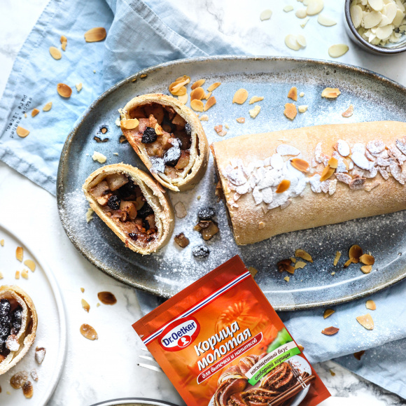 Разогреваем духовку до 180 градусов. Аккуратно перекладываем рулет на предварительно смазанный маслом либо застеленный пергаментной бумагой противень. Размещаем противень на средней полке духовки и выпекаем в течение 25 минут. По истечении этого времени достаём противень, смазываем штрудель сливочным маслом, посыпаем миндальными лепестками и отправляем выпекаться ещё на 20 минут.