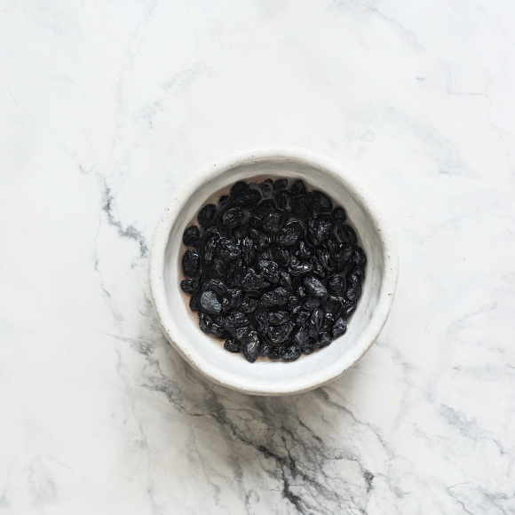 Крупный изюм без косточек предварительно перебираем, промываем под проточной водой, просушиваем с помощью бумажных полотенец и замачиваем в коньяке на 3-4 часа.