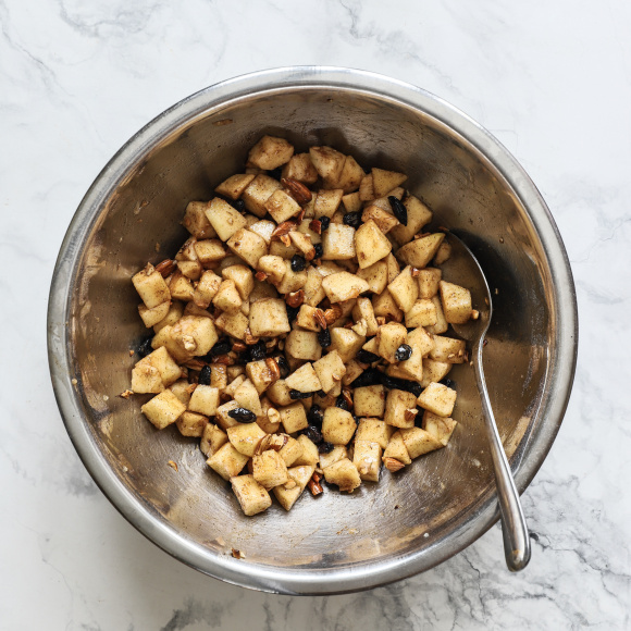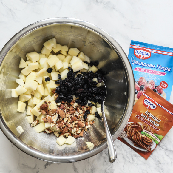 В миску к яблокам добавляем изюм, измельченный миндаль, сахарную пудру и корицу. Аккуратно перемешиваем ингредиенты будущей начинки.