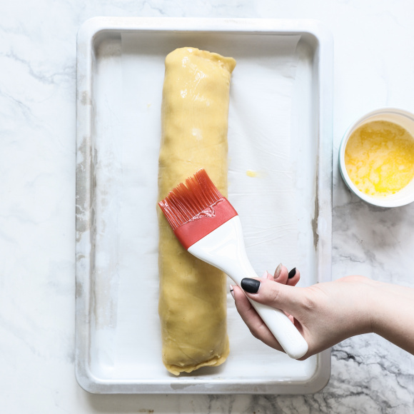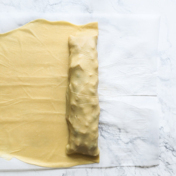 Выкладываем начинку вдоль длинной стороны прямоугольника. Аккуратно сворачиваем тесто в плотный рулет, защипываем края и переворачиваем рулет швом вниз.