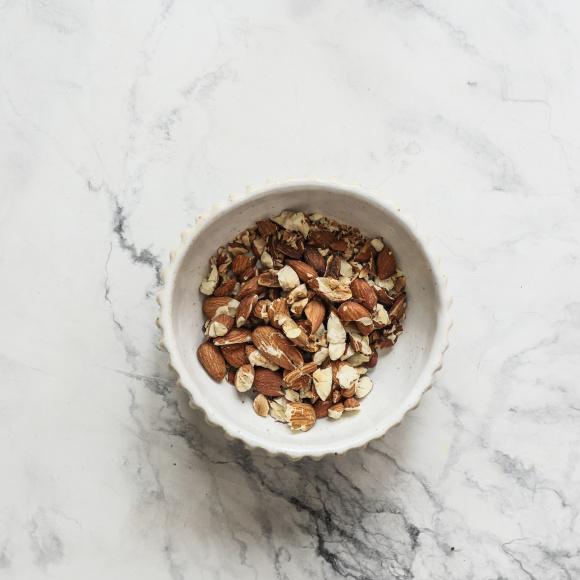 Очищенные ядра миндаля обжариваем на сухой сковороде на среднем огне, даём им остыть, после чего, используя блендер либо кофемолку, измельчаем миндаль в мелкую крошку.