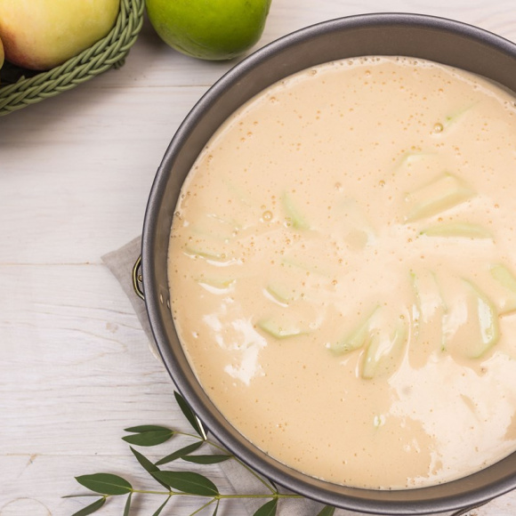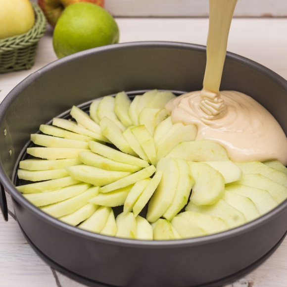 Используя ложку или лопатку перекладываем тесто в форму, покрывая яблочки, и разравниваем.