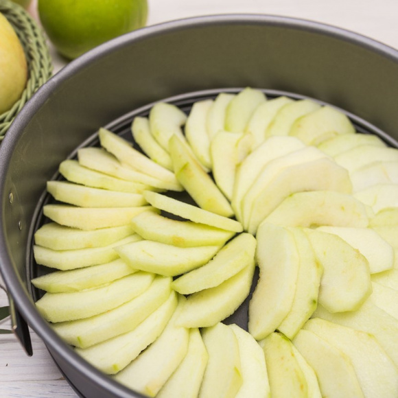 Форму для выпечки смазываем сливочным маслом и присыпаем мукой (можно вместо муки посыпать панировочными сухарями с сахаром, так у готовой шарлотки появится хрустящая карамельная корочка) Кладем в форму подготовленные яблочные дольки, равномерно распределяем.