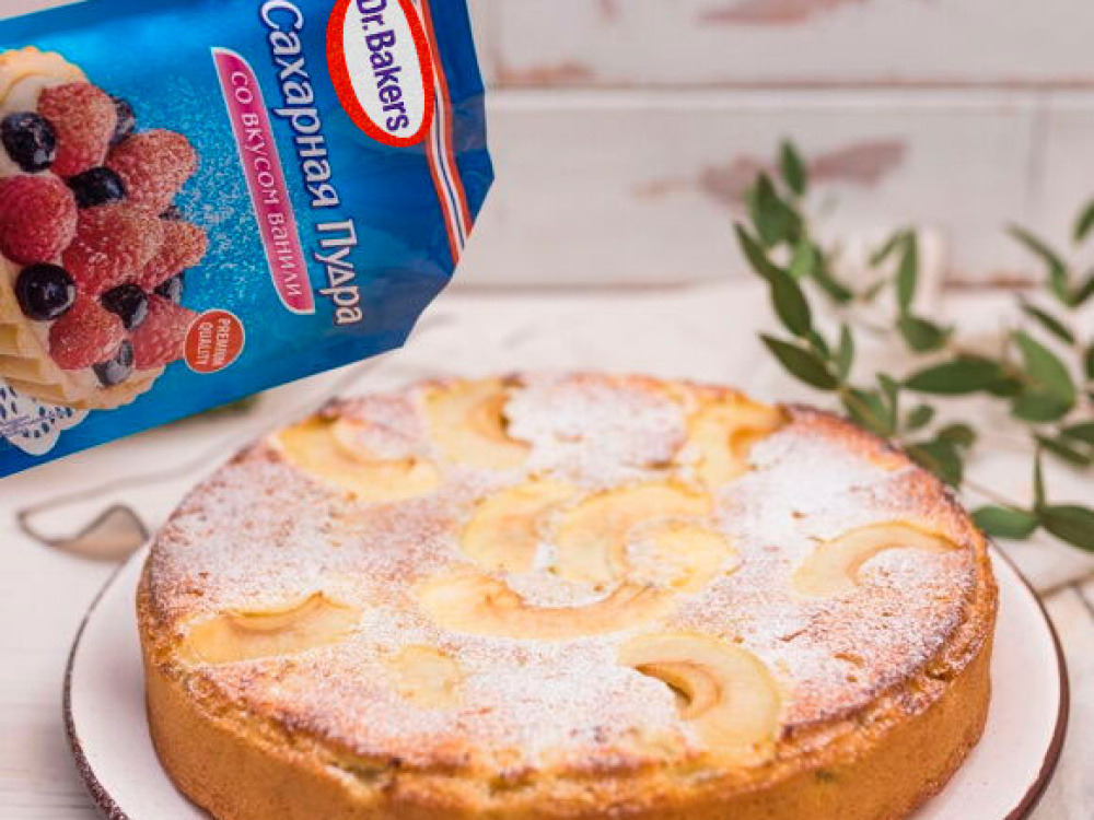Готовый пирог с яблоками, с помощью мелкого сита, посыпаем сахарной пудрой и, нарезав на порционные кусочки, подаем к столу.