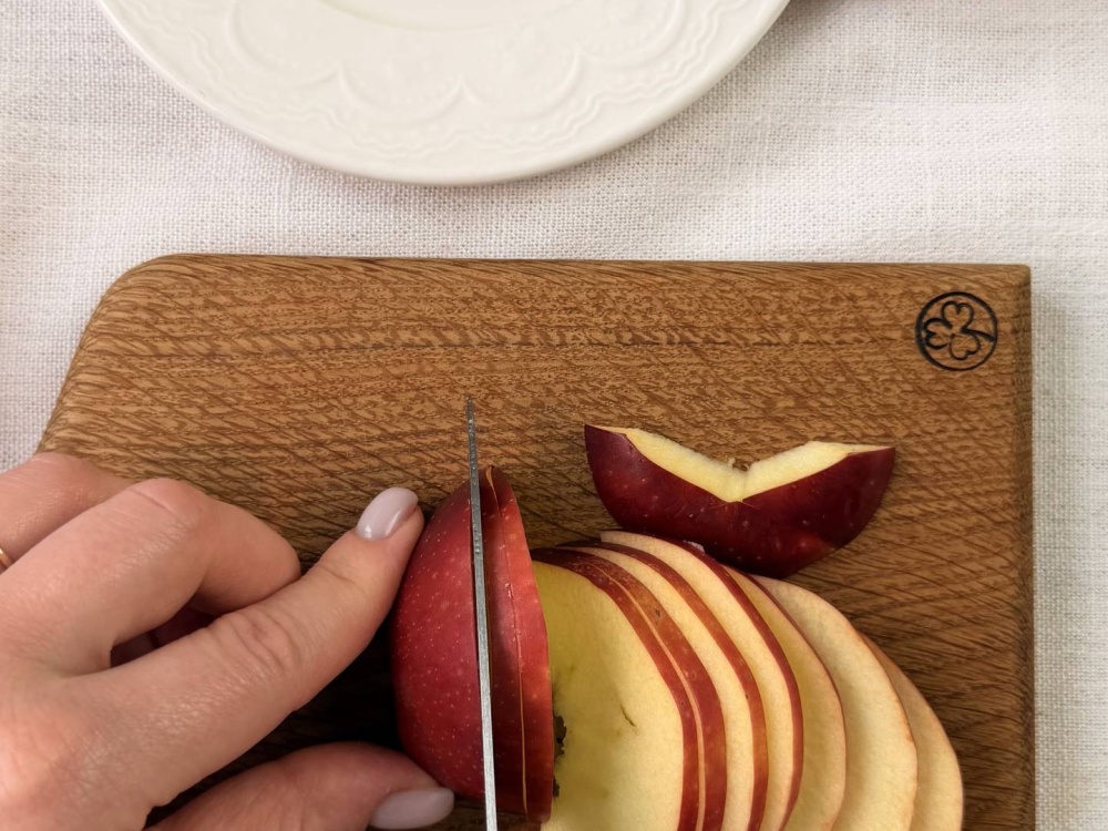 Подготавливаем яблоки. Фрукты нужно хорошо помыть, высушить и нарезать дольками. Готовую начинку выкладываем на дно чаши.